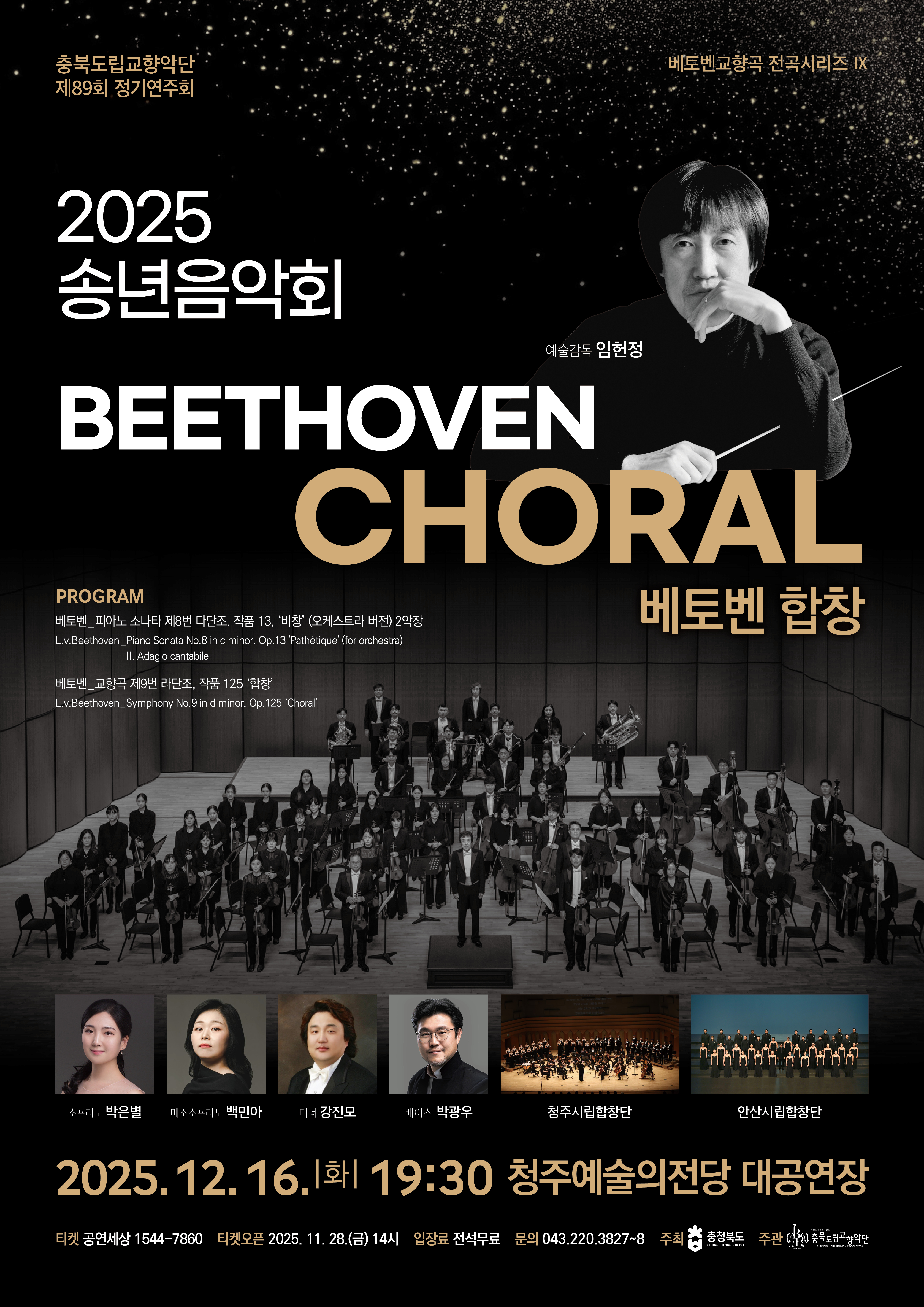 2025송년음악회_베토벤교향곡 전곡시리즈 Ⅸ '베토벤, 합창' - 일 시 : 2025. 12. 16.(목) 19:30 - 장 소 : 청주예술의전당 대공연장 - 출 연 : 예술감독 임헌정, 소프라노 박은별, 메조소프라노 백민아 테너 강진모, 베이스 박광우, 청주시립합창단, 안산시립합창단 ◆ 티켓예매: 공연세상(1544-7860/ concertcho.com) ◇ 티켓오픈: 11월 28일(금) 14시 (전석무료) |