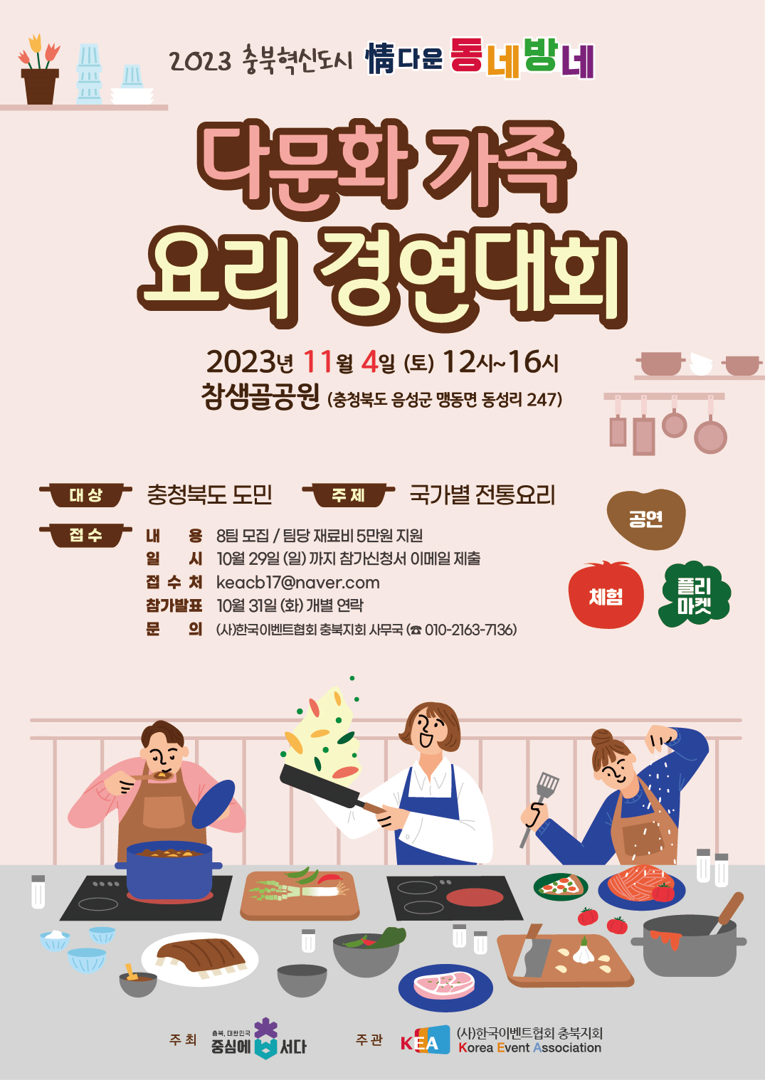 - 행 사 명 : 2023년 충북 문화혁신도시 情다운‘동네방네’ - 주최/주관 : 충청북도 / (사)한국이벤트협회 충북지회 - 행사일정 : ‘23.11.4.(토) 12:00~16:00 - 행사장소 : 충북혁신도시 참샘골공원(음성군 맹동면 동성리 247) - 행사내용 : 다문화가족 요리 경연대회, 충북예술인 공연, 프리마켓 및 체험부스 ※ 다문화가족 요리 경연대회 - 참가대상 : 충청북도 도민 - 주 제 : 국가별 전통요리 - 접수일시 : '23.10.29.(일)까지 이메일제출(keacb17@naver.com) - 발 표 : '23.10.31.(화) 개별연락 |