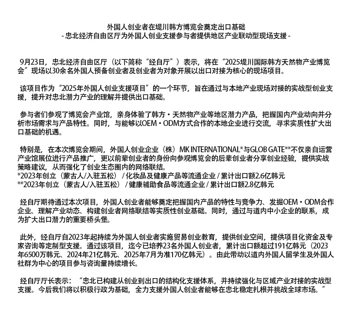 홈 CBFEZ宣传馆 新闻 新闻 sns 공유 트위터 공유하기 페이스북 공유하기 카카오스토리 공유하기 블로그 공유하기 URL복사 인쇄하기 负责人 部门 : 投资促进部 咨询电话 : +82-43-220-8372 新闻 상세보기 - 제목, 내용, 파일 제공 外国人创业者在堤川韩方博览会奠定出口基础 내용 사진 확대보기 外国人创业者在堤川韩方博览会奠定出口基础 파일 jpg 문서 중문5.jpg 미리보기 목록 이전글 清州航空城第三地区居民将如愿以偿,补偿工作全面启动 다음글