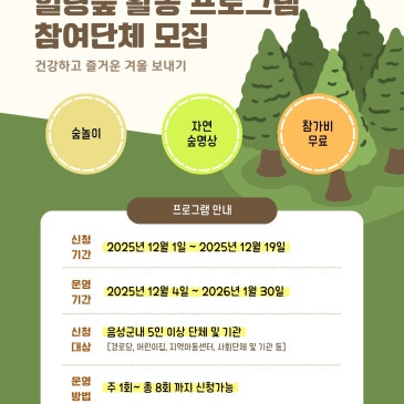 Q. 건강하고 즐거운 겨울을 보내는 방법은? A. 힐링숲 활동 프로그램 참여하기! 안녕하세요 저희 음성군에서 농한기를 맞아 #건국대학교글로컬캠퍼스 RISE 사업단과 함께 진행하는 사업이 있다는 사실! 알고 계셨나요? 바로 #힐링숲활동프로그램 인데요 숲놀이는 물론이고 숲에서 명상까지 즐길 수 있으면서 참가비는 무료라고 합니다!! (물론 지금은 추우니 야외활동보다는 실내 위주로 하겠죠...?) 현재 이 프로그램에 참여할 단체 및 기관을 모집 중인데요 그럼 빠르게 알아 보도록 하겠습니다 힐링숲 활동 프로그램 참여단체 모집 안내 이상으로 힐링숲 활동 프로그램 참여단체 모집에 대해 안내해 드렸습니다! 참고로 힐링숲.......