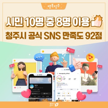 올해 1년간의 청주시 공식 SNS에 대한 시민 여러분의 의견을 토대로 다가오는 2026년, 여러분이 원하시는 정보와 콘텐츠로 운영하기 위해 설문조사를 실시했습니다. 시민 10,254명 응답 만족도 점수 92점 시민 여러분들은 어떤 의견을 주셨는지 알아볼까요? 청주시는 블로그를 비롯해 유튜브, 인스타그램(오피셜정책 2개 채널), 페이스북(페이지), 카카오채널, 당근 등 총 7개 공식 채널을 운영하고 있습니다. 또한 재난 상황에서는 보다 신속한 안내를 위해 X(구 트위터) 채널을 추가로 활용하고 있습니다. 올해 1년간 청주시 공식 SNS가 시민 여러분께 얼마나 유용했는지, 어떤 점을 더 보완해야 하는지 의견을 듣고자 만족도 조사를 실시했습.......