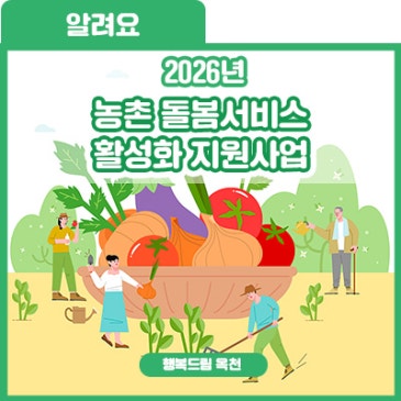 안녕하세요! 행복드림 옥천 입니다! 2026년부터 농업 돌봄서비스 활성화 지원사업을 시작합니다! 다양한 농업 활동을 통해 옥천군민들이 더욱 건강해지길 바라며 운영하는 사업입니다. 농업 활동은 단순히 작물을 생산하고, 판매하는 것에 그치지 않는데요. 농업이 돌봄, 교육, 고용 등 다양한 서비스를 제공하기도 한다는 사실! 더불어 이러한 활동을 기반으로 지역 공동체를 더욱 단단히 만들어 갈 수도 있겠죠. 어떤 활동을 지원받을 수 있는지 알아볼까요? 어떤 이들이 지원 대상인가요? 농촌돌봄농장과 농촌주민생활돌봄공동체가 사업 대상자입니다. 농촌돌봄농장 - 사회적 농업을 사회적 약자와 함께 실천하는 농촌지역 소재 조직.......