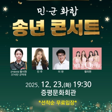 증평군과 37사단이 함께하는 민군화합 송년콘서트 이번 공연은 선착순 무료입장으로 진행되어, 부담 없이 문화공연을 즐길 수 있는 좋은 기회입니다. 추운 겨울밤, 송년 콘서트에서 마음이 따뜻해지는 시간보내세요. #증평 #송년콘서트 #37사단 #진주 #이한 #할리퀸