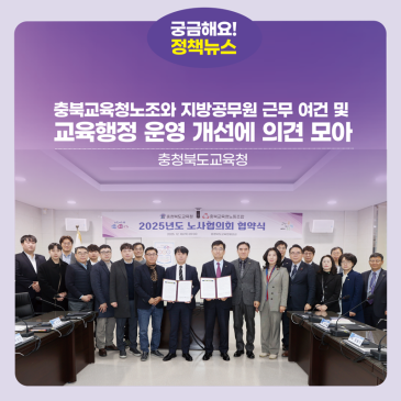 충청북도교육청(교육감 윤건영)은 18일(목) 오전, 본관 회의실에서 충북교육청노동조합(위원장 유여종)과 2025년도 노사협의회 합의안에 대한 협약식을 개최하였다. 협약식에는 윤건영 교육감과 유여종 충북교육청노동조합 위원장을 비롯해 관련자가 함께 했다. 학교 현장의 근무 여건 개선과 행정업무 효율화 방안이 담겼다. 주요 내용으로는 학교운영위원회 종이 없는 회의를 위한 노트북(태블릿PC) 자체 확보 권장 통학차량 안전성 확보를 위한 자체 정비기간 부여 3식 학교(기관) 업무부담 경감을 위한 정원조정 시 조리직렬 의견 수렴 강화 등이 포함됐다. 또한, 지방공무원의 복지와 처우 개선을 위해 지방공무원 맞춤형복지비 상.......
