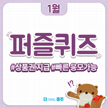 상품실은 퍼즐퀴즈 2026년 1월 퍼즐퀴즈! 함께 풀어보세요^.^ 상품실은 퍼즐퀴즈 2026년 1월호 퍼즐퀴즈! 함께 풀어보세요 응모자격 : 충주시민 응모마감 : 2026년 1월 10일(도착분까지) 응모방법 : 우편엽서, 온라인 응모 유의사항 : 동일인, 동일 아이디 중복 접수 불가 우편접수 : (27339) 충북 충주시 으뜸로 21, 충주시 홍보담당관실 도로명 주소를 사용해 주세요! 문의 : 043) 850-5082 발표 : 2026년 1월호 월간 예성 및 충주시 블로그 게재 상품 : 충주사랑 상품권 3만원 수집한 개인정보는 상품 발송 및 이벤트 종료시 지체없이 파기됨을 알려드립니다. <가로> 1. 충주시는 만성적자 해소 및 안정적인 수돗물 공급을.......