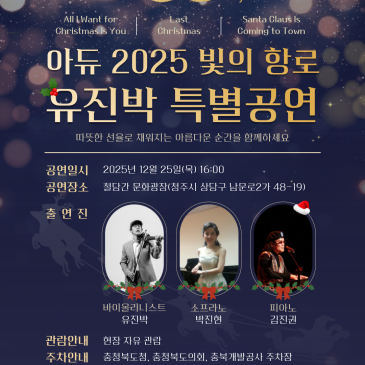 아듀 2025 빛의 향로, 유진박 특별공연 크리스마스의 오후, 아름다운 선율로 2025년의 마지막을 장식합니다. 바이올리니스트 유진박과 소프라노 박진현, 피아노 김진권이 함께하는 연말 특별 무대를 만나보세요. 공연일시 : 2025. 12. 25.(목) 16:00 공연장소 : 철당간 문화광장 관람안내 : 현장 자유 관람 크리스마스에 어울리는 깊고 따뜻한 음악, 소중한 사람과 함께 특별한 시간을 보내시기 바랍니다.