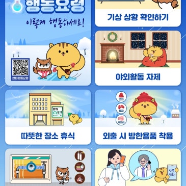 기온이 큰 폭으로 떨어지며 한파특보가 이어지고 있습니다. 이번 겨울, 모두가 안전하도록 한파 6대 행동요령 꼭 확인해주세요! 이렇게 실천해주세요! 1 기상 상황 확인하기 기상청 및 충북 기상정보를 수시로 체크해 대비하세요 2 야외활동 자제 어린이어르신야외근로자는 한파 시 외출을 최대한 줄여주세요 3 따뜻한 장소에서 휴식하기 한파쉼터 등 따뜻한 공간을 적극 이용하세요 4 외출 시 방한용품 착용 모자장갑목도리 필수! 체온 유지가 가장 중요합니다 5 수도관 동파 예방 수도꼭지 살짝 틀어놓기, 배관 보온재 감싸기 등 미리 준비하세요 6 주변 이웃 안전 살피기 홀로 계신 어르신, 거.......