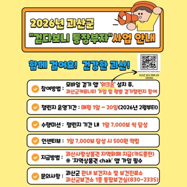 [괴산소식] < "걷다보니 통장부자" 사업안내 > 함께 걸어요! 건강한 괴산! 1.참여방법: 모바일 건기 앱 '워크온' 설치후, 괴산군 커뮤니티 가입 및 월별 걷기챌린지 참여 2.챌린지 운영기간: 매월 1일 20일(2026년 2월부터) 3.수행미션: 챌린지 기간 내 1일 7,000보 씩 달성 4.인센티브: 1일 7,000보 달성 시 500원 적립 5.지급방법: 괴산사랑상품권 지역화폐 지급(카드충전) '지역상품권 chak' 앱 가입 필수 6.문의사항: 괴산군 관내 보건지소 및 보건진료소 7.괴산군보건소 1층 통합보건실(830-2335) #괴산군청 #충북괴산 #괴산소식 #건강한괴산 #걷기운동 #걷다보니통장부자