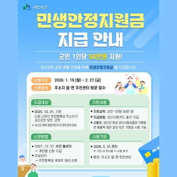[괴산소식] < 민생안정지원금 지급 안내 > 군민 1인당 50만원 지원! 괴산군은 군민 생활 안정을 위해 민생안정지원금을 지급합니다. 신청기간: 2026. 1.19(월) 2. 27.(금) 신청장소: 주소지 읍면 주민센터 방문 접수 지급대상 2025. 12. 31. 기준, 신청 시까지 주민등록상 주소지가 괴산군인 모든 군민 * 괴산군 체류 결혼이민자 및 영주권자 포함 지원내용 지원금액: 군민 1인당 50만 원 지급방법: 괴산사랑카드 충전 지급 사용처: 괴산군 관내 괴산사랑상품권 가맹점 연 매출액 제한 없이 모든 가맹점 사용 가능 신청방법 2007. 12. 31. 이전 출생자 개인별 신청지급 미성년자 주민등록상 세대주 대리 신청.......