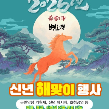 2026년 신년 해맞이 행사 2026년 병오년 새해 힘찬 출발과 한 해의 안녕과 번영을 기원하는 신년 해맞이 행사를 진행합니다. - 일 시 - 2026. 1. 1. 아침 7시 - 장 소 - 삼기천(주공4단지 옆 사곡교) - 내 용 - 군민안녕 기원제, 신년 메시지, 초청공연 등 #증평 #해맞이 #병오년 #사곡교 #증평해맞이 #증평행사 #2026년
