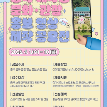 충북 도내 대학에 재휴학 중인 대학생이라면 주목 충북 문화관광 명소 홍보를 위한 1분 숏폼 공모전이 시작됐습니다 자세한 내용은 충북문화재단 관광사업본부 홈페이지 알림사항 고시/공고 게시판의 공고문을 참고해주세요 공모명 : 2026 충북 대학생 문화관광 홍보 영상 제작 공모전 주최/주관 : 충북문화재단 접수기간 : 2026. 4. 1.(수) 4. 10.(금) 공모내용 : 도내 문화관광자원 장소 홍보를 위한 1분 세로형 숏폼 동영상 제작 공모주제 : 5개 중 택 1 청남대 둘레길 : 숲과 호수 산책로를 따라 걸을 수 있는 둘레길 청남대 모노레일 : 대청호의 절경을 한 눈에 즐길 수 있는 모노레일.......