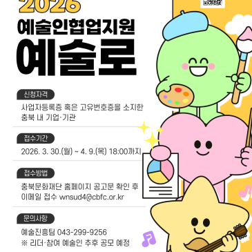 예술인과 협업할 기업 찾습니다! 예술인과 함께 창의적인 프로젝트를 운영할 기업기관을 모집합니다 기업에는 새로운 문제 해결 방법을, 예술인에게는 협업 기회를! 지금, 함께 변화를 만들어보세요 모집대상: 충북 내 기업기관 모집건수: 7개소 접수기간: 2026. 3. 30. 4. 9. 18:00까지 활동기간: 2026. 6. 11. 문의사항: 예술진흥팀 043-299-9256 공고 자세히 보기