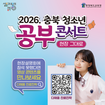 충북 청소년 공부 콘서트, 놓쳤다고 아쉬워하지 마세요 혹시 지난 3월 말에 열렸던 청소년 공부 콘서트 소식 들으셨나요? 직접 가보고 싶었지만 시간이 맞지 않아 발을 동동 구르셨던 분들이 많더라고요. 이제는 편안하게 집에서 그 생생한 이야기를 다시 만날 수 있게 되었습니다. 현장에 가지 못했던 아쉬움을 달래줄 방법은 바로 '다채움 진로진학' 플랫폼이에요. 그날의 뜨거웠던 대입 열기를 영상 콘텐츠 속에 고스란히 담아두었거든요. 지금 바로 접속해서 대입 열기로 가득했던 현장의 목소리를 직접 확인해 보세요.