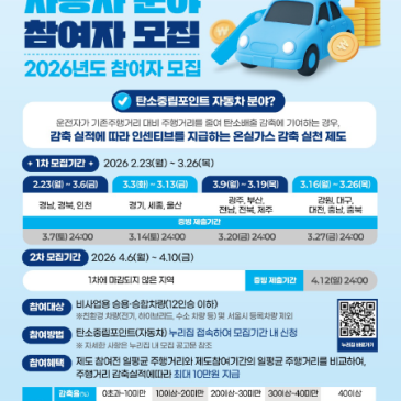 탄소중립포인트 자동차 분야 참여자 모집 2차 모집 기간이오니 희망하시는 분들께서는 기간 내 신청하여 주시기 바랍니다! 기간: 2026. 4. 6.(월)4. 10.(금) 모집대상: 12인승 이하 비사업용 승용 승합 차량(738대) 친환경자동차(전기, 수소, 하이브리드 등) 제외 참여방법: 탄소중립포인트제(자동차) 홈페이지 신청(car.cpoint.or.kr) 문의: 탄소중립포인트 콜센터 1660-2030