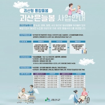 [괴산소식] 괴산은늘봄(괴산형 통합돌봄)사업 괴산은늘봄사업은 노쇠, 장애, 질병, 사고 등으로 일상생활에 어려움이 있어 복합지원이 필요한 노인을 대상으로 의료요양돌봄서비스를 제공하는 사업입니다. [ 우선 적용대상자 ] 장기요양 재가급여자(1-5등급, 인지지원 등급), 등급외자, 노인맞춤형돌봄 중점군, 퇴원환자, 고령장애인 등 입원입소 경계선상의 65세 이상 노인 신청 방법 및 제공서비스 등 상세내용은 상단 이미지 내용을 참조해주세요. [ 신청 및 문의처 ]