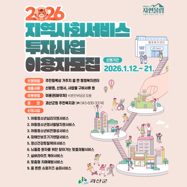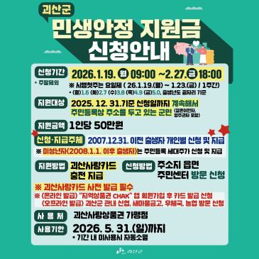 [ 괴산소식 ] 민생안전 지원금 신청안내 신청기간 2026. 1. 19.(월) 09:00 2. 27.(금) 18:00 주말 제외 시행 첫 주는 요일제 (26.1.19.(월) 1.23.(금) / 1주간) (월) 16 / (화) 27 / (수) 38 / (목) 49 / (금) 50 출생년도 끝자리 기준 지원대상 2025. 12. 31. 기준 신청일까지 계속해서 주민등록상 주소를 두고 있는 군민 (결혼이민자, 영주권자 포함) 지원금액 1인당 50만원 신청지급주체 2007. 12. 31. 이전 출생자 개인별 신청 및 지급 미성년자(2008. 1. 1. 이후 출생자)는 주민등록 세대주가 신청 및 지급 지원방법 괴산사랑카드 충전 지급 괴산사랑카드 사전 발급 필수 (온라인 발급) 지역상품.......