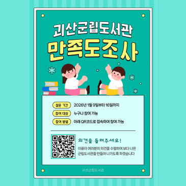 [ 괴산소식 ] 괴산군립도서관 이용 만족도 설문조사 안내 기간 : 2026. 1. 9.(금) 1.16.(금) 대상 : 누구나 참여방법 : QR코드 접속(괴산군청 및 괴산군립도서관 누리집 참고) 또는 참여링크 (https://naver.me/FFaLXCWN) 접속 #괴산소식 #괴산군립도서관 #도서관설문조사 #이용만족도조사 #괴산군청 #괴산설문 #군민참여 #온라인설문 #QR설문 #괴산이벤트 #괴산정보 #괴산공지