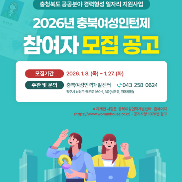 2026 충북여성인턴제 참여자 모집 충청북도 공공분야 경력형성 일자리 지원 평생에 단 한 번, 공공분야에서 경력을 다시 시작할 기회 선호도 높은 공공분야 배치 약 8개월의 안정적인 근무기간 하루 7시간 근무로 일생활 균형까지 경력을 다시 잇고, 지금의 능력을 살릴 시간입니다 충청북도가 경력보유여성 여러분의 다음 커리어를 응원합니다. 모집분야 늘봄학교 행정지원(14명) 지역사회 복지지원(20명) 문화콘텐츠 기획지원(11명) 접수기간 2026. 1. 8.(목) 1. 27.(화) 18:00까지 자세한 사항은 '충북여성인력개발센터' 홈페이지 참고
