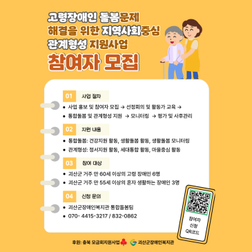 [ 괴산소식 ] 고령장애인 돌봄문제 해결을 위한 지역사회중심 관계형성 지원사업 참여자 모집 사업 절차 사업 홍보 및 참여자 모집 선정회의 및 활동가 교육 통합돌봄 및 관계형성 지원 모니터링 평가 및 사후관리 지원 내용 통합돌봄: 건강지원 활동, 생활돌봄 활동, 생활돌봄 모니터링 관계형성: 정서지원 활동, 세대통합 활동, 마을중심 활동 참여 대상 괴산군 거주 만 60세 이상의 고령 장애인 6명 괴산군 거주 만 55세 이상의 혼자 생활하는 장애인 3명 신청 문의 괴산군장애인복지관 통합돌봄팀 070-4415-3217 / 832-0862 후원: 충북 모금회지원사업 주관: 괴산군장애인복지관 #괴산군 #괴산 #괴산군장애인.......