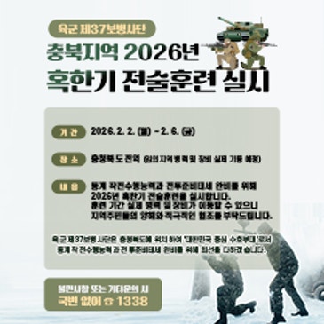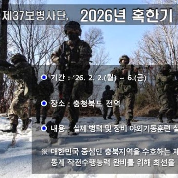 육군 제37보병사단, '26. 2. 2.(월)6.(금)까지 충북지역 혹한기 전술훈련 실시, 병력과 장비의 실제 기동 예정으로 지역주민들의 양해와 적극적인 협조를 바랍니다.