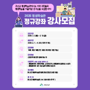 [괴산소식] 2026년 평생학습관 정규강좌 강사 모집 괴산군 평생학습관에서는 지역 주민들의 평생학습을 이끌어갈 강사님을 모집합니다. 모집기간 2026.2.2.(월). 2.13.(금). 운영기간 2026. 4. 1. 6. 30. (12주 주 1회) 모집과정 18개 과정 18명 ( 1인 최대 2개 과정 지원 가능) 모집대상 신청자격에 모두 충족하는 자 신청자격 : 다음 요건을 충족하는 자 - 해당분야의 전문자격증 소지자이거나 해당분야(장관상) 수상자 - 해당분야의 3년 이상 실무경력이 있는자 접수방법 괴산군 평생학습관 방문 (괴산군립도서관 3층) 문 의 처 괴산군 평생학습관 (. 043-830-3767)