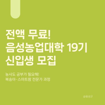 전액 무료! 음성농업대학 19기 신입생 모집 안녕하세요! 음성군 농업의 밝은 미래를 함께 그려나갈 반가운 소식을 가져왔습니다. 현재, 제19기를 맞이한 '음성농업대학'이 2026년도 신입생을 모집하고 있는데요. 전액 무료 교육이라는데, 이 소중한 기회를 놓칠 수 없겠죠? "농사, 그냥 몸으로 부딪치면 되는 거 아냐?"라고 생각하셨다면 오산입니다. 요즘은 체계적인 데이터와 맞춤형 기술이 수익을 결정하는 시대입니다. 탄탄한 이론은 기본! 현장에서 직접 부딪치는 실습과 마지막 종합 시험까지 알차게 구성되어 있는데요. 교육비와 교재비가 전액 무료인 것은 물론, 공식 교육 시간까지 인정받을 수 있어 일석이조입니.......