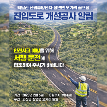 박달산 산림휴양단지 및 장연면 오가리 골프장 조성을 위한 진입도로 개설공사가 시작되었습니다. 공사 기간 중 안전을 위해 해당 구간을 통행하는 운전자분들의 적극적인 협조 부탁드립니다. 구간: 괴산군 장연면 오가리 일원 기간: 2026년 2월 5일 10월까지 (부분 준공) 공사 구간 내 안전사고 예방을 위한 서행 운전 및 안전거리 유지 더욱 편리하고 안전한 도로 환경을 만들기 위해 최선을 다하겠습니다. 불편하시더라도 양해 부탁드립니다.