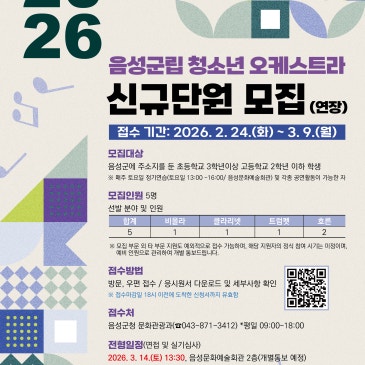 음성군립 청소년 오케스트라 신규단원의 모집 기간을 연장합니다 지난 1월에 음성군립 청소년 오케스트라 신규단원 모집에 대해 안내해 드렸는데요 본래 2월 20일까지였던 모집 기간을 3월 9일까지 연장한다고 합니다 접수 장소 안내 군민 여러분들의 많은 관심과 참여 부탁드립니다! 문의전화 음성군 문화관광과(043-871-3412) #음성 #음성소식 #음성군립오케스트라 #청소년오케스트라 #오케스트라모집 #비올라 #클라리넷 #호른 #트럼펫