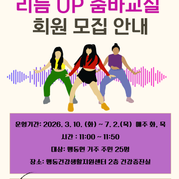 줌바댄스로 건강한 생활 시작! 안녕하세요 지난번에 맹동건강생활지원센터에서 진행 예정인 여러 프로그램을 소개해 드렸었는데요 이번에는 줌바교실이 열린다고 해서 안내해 드리려고 합니다 줌바댄스는 짧은 시간 동안 많은 칼로리를 소모할 수 있어서 인기가 많은데요! 그럼 빠르게 알아보도록 할까요? 맹동건강생활지원센터 줌바교실 회원 모집 안내 맹동건강생활지원센터 위치 이상으로 맹동건강생활지원센터에서 진행하는 줌바교실에 대해 안내해 드렸습니다 운동을 해보고 싶지만 지루하지 않을까 고민했던 분들! 이 기회에 줌바와 함께 건강도, 즐거움도 모두 챙기세요 문의전화 맹동건강생활지원센터(.......