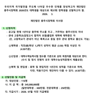 2026년도 충주시장학회 장학생 선발 알림 신청기간: 2026. 3. 16.(월)3. 27.(금) 신청방법: 방문 또는 우편접수만 가능 매일 오후 4시 접수 마감