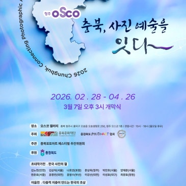 안녕하세요. 충북문화재단입니다! 전시컨벤션예술이 만나는 곳, 충북갤러리 청주오스코관이 문을 엽니다 청주오스코 1층에 새로운 문화공간이 생겼습니다. 전시도 보고, 행사가 열리는 공간이 예술과 함께 호흡하는 곳. 바로 "충북갤러리 청주오스코관"입니다. 마이스(MICE) 중심 공간이 문화예술 플랫폼으로 확장되는 첫 시작이라 더 의미 있는 개관입니다. 그리고 이 공간의 첫 전시로 특별한 페스티벌이 열립니다. 2026 충북 PHOTO ART 페스티벌 충북, 사진 예술을 잇다 2026. 2. 28.(토) 4. 26.(토) 매주 월요일 휴관 장소: 청주오스코 1층 충북갤러리 청주오스코관 이번 전시는 사진을 어떻게 바라볼.......