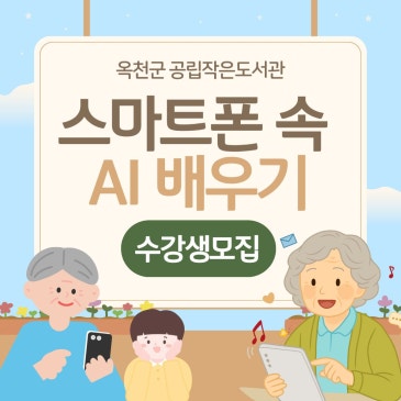 스마트폰 하나로 AI를 배울 수 있는 기회!! 뉴스에서는 매일 나오는 인공지능, 어디서부터 어떻게 시작해야 할지도 모르겠구 "기계치인 나는 어렵지 않을까?" 걱정도 되신다구요? 걱정은 그만 STOP! 옥천군은 공공도서관은 이원, 군북, 군서의 공립작은도서관에서 원하는 주민 누구나 AI를 배우실 수 있도록 스마트폰 하나로 배우는 AI 강좌를 준비했어요 무거운 노트북도, 거창한 준비물도 필요 없답니다. 스마트폰 하나면 충분!! 무엇을 배울까요? 막연하고 어려운 "AI 배우기"가 아니에요 실생활에서 유용하게 사용하고, 누구나 즐겁게 따라할 수 있는 내용들이 준비되어 있어요. 1. 이미지와 영상 만들기 내가.......