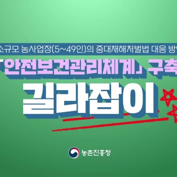 알고 보면 쉬운 중대재해처벌법, 함께 알아볼까요? 안녕하세요 지난 2022년에 시행된 중대재해처벌법이 벌써 4년째를 맞이했습니다 특히 소규모 농사업장에서도 중대재해처벌법이 적용되는데요 실제로 농작업 도중 매년 700여 건의 중대재해가 발생한다고 합니다 이에 따라 안전보건관리체계를 구축하는 것이 중요한데요! 이번엔 소규모 농사업장에서의 중대재해처벌법 대응 방안에 대해 알아보는 시간을 가져 보겠습니다 중대재해처벌법이란? 사업주 또는 경영책임자 등이 안전 확보 의무를 이행해 중대재해를 예방하는 데 궁극적인 목적을 둔 법령입니다. 자세한 내용은 한국산업안전보건공단의 누리집을 참고해 주세요! 모두의 안.......