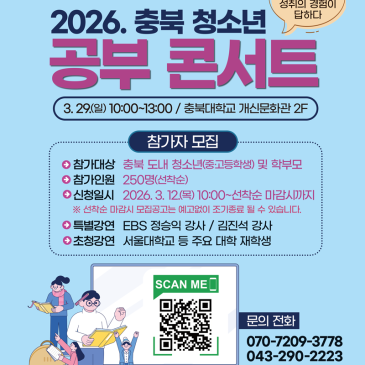 요즘 어떻게 공부해야 할지 고민이 많으시죠? 나에게 맞는 공부법을 찾지 못해 한참을 헤맸던 기억이 있는데요. 변화하는 입시 환경을 마주하면 마치 안개 속을 걷는 것처럼 막막한 기분이 들기도 하더라고요. 이런 고민을 안고 계신 충북의 청소년과 학부모님들을 위해 특별한 자리가 마련했어요. 오는 3월 29일에 열리는 '2026 충북 청소년 공부 콘서트'가 여러분의 답답함을 시원하게 풀어줄 거예요. 꿈을 현실로 만드는 실질적인 학습 전략 공부에도 나만의 지도가 있다면 얼마나 든든할까요? 이번 콘서트에서는 서울대학교 재학생들과 의예과 재학생이 직접 멘토로 나서 선배들이 직접 겪으며 깨달은 생생한 학습 노하우를 아낌없.......