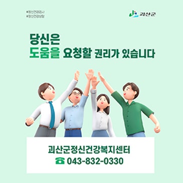 [괴산소식] 괴산군정신건강복지센터 운영안내 정신건강에 어려움이 있다면 도움을 요청하세요! [운영안내] 대상: 괴산군민, 괴산군소재 직장인, 학생 등 내용: 정신건강검사 및 상담(우울, 불안, 스트레스, 자살사고 등) 비용: 무료 운영: 평일 09:0018:00 어떻게 도움을 받나요 ? 24시간 정신건강상담전화 . 1577-0199 괴산군정신건강복지센터 . 043-832-0330 (평일 09:0018:00) 삶이 지치고 힘들 때 전화주세요
