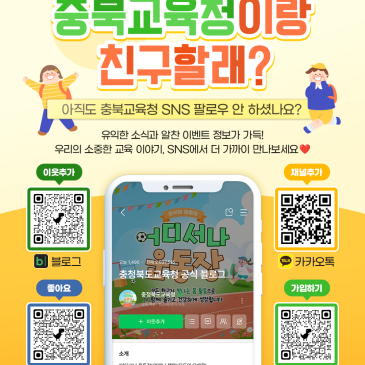 "충북교육청이랑 친구할래? 유익한 교육 소식, 이제 SNS에서 더 가까이!" 아직도 충북교육청 SNS 팔로우 안 하셨나요? 우리 아이들의 소중한 교육 이야기부터, 놓치면 아쉬운 알찬 이벤트 정보까지! 충북교육의 모든 소식을 가장 빠르게 전해드리기 위해 다양한 채널을 운영하고 있습니다. SNS를 통해 더욱 가까이에서 만나보세요. [충청북도교육청 공식 SNS 채널 바로 가기] - 블로그: https://blog.naver.com/cbe_news - 페이스북: https://www.facebook.com/chungbuk.edu - 카카오톡: https://pf.kakao.com/_hxmxhvK - 밴드: https://www.band.us/band/89656762/post 이미지 활용 꿀팁! 1카드뉴스 이미지 휴.......
