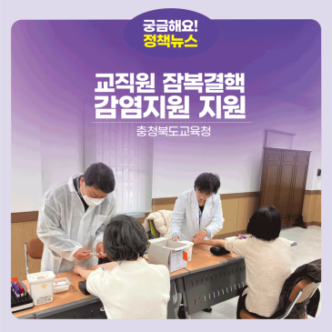 충청북도교육청(교육감 윤건영)은 학교 내 결핵 감염 예방과 교직원 건강 보호를 위해 2026년 도내 학교 교직원을 대상으로 잠복결핵감염검진 지원사업을 추진한다고 밝혔다. 잠복결핵감염은 증상이나 전염성은 없지만 면역력이 저하될 경우 결핵으로 발병할 수 있어 조기 발견과 관리가 중요하다. 이번 사업은 2026년 3월부터 11월까지 추진되며, 유치원초중고특수학교 및 각종학교 교직원을 대상으로 실시된다. 검진 대상은 학교 신규발령자 및 신규채용자 기관 소속 직원 중 학교 파견순회 근무자 기관에서 학교로 발령된 직원 중 미검진자 기존 검진 기록 확인이 어려운 재검사자 등으로 채용(근무)후 1개월 이내 검진을 실.......